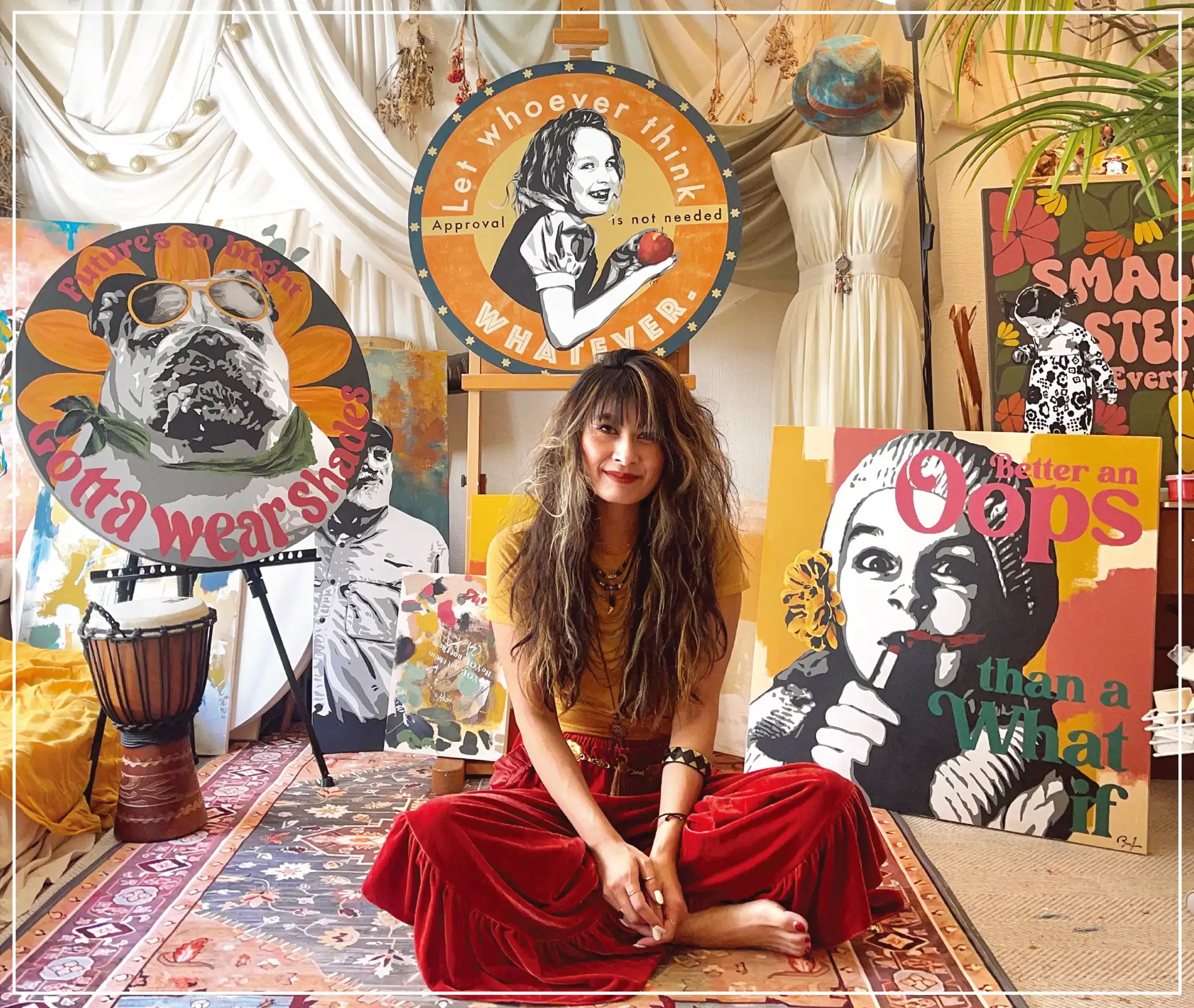 この度、アーティスト5周年記念個展をさせていただきます。 原画新作たちを並べ、他、アパレルやトートバックなどのグッズも販売を致します。